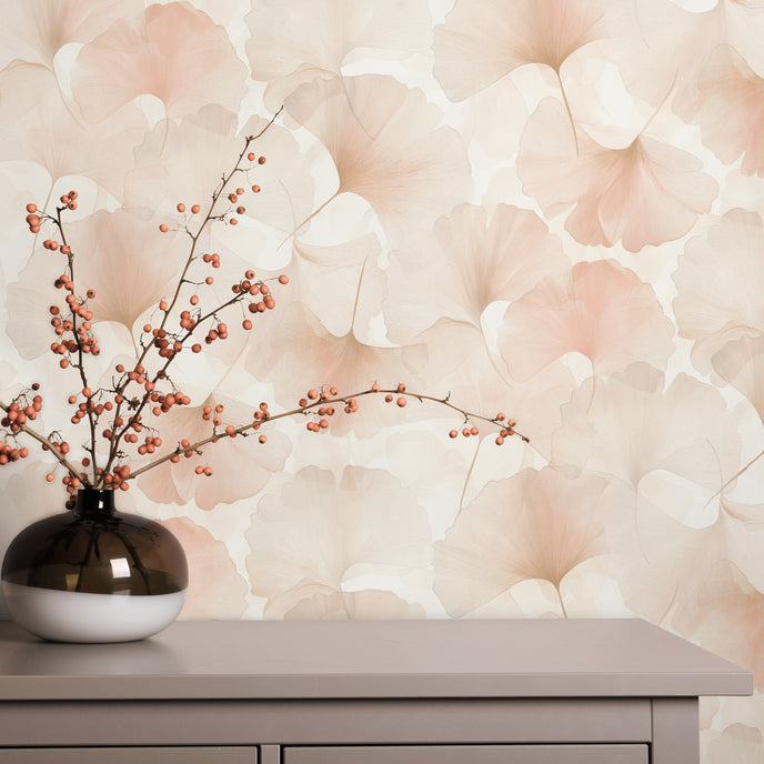 This glamorous contemporary wallpaper features lined ginkgo biloba leaves that are coated heavily with a luxury gorgeous metallic sparkle. The leaves overlap to form a slightly geometric pattern, while the shimmer and linework take this wallpaper to the next level. Use in a statement wall to add a high level of luxury sophistication to your room.
