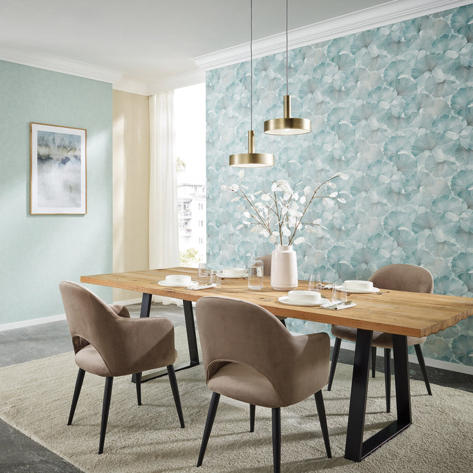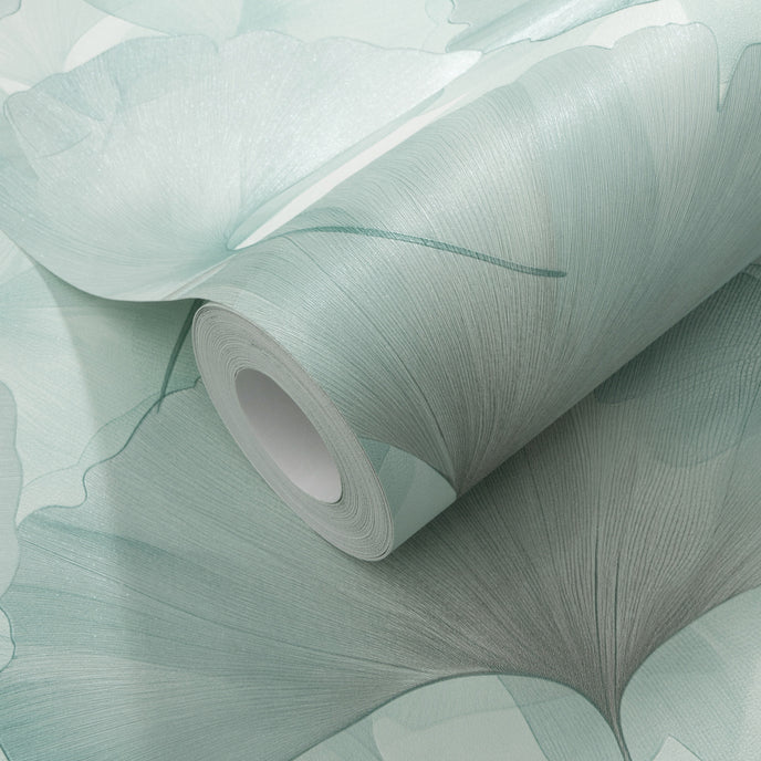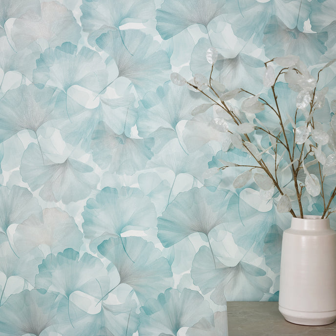 This glamorous contemporary wallpaper features lined ginkgo biloba leaves that are coated heavily with a luxury gorgeous metallic sparkle. The leaves overlap to form a slightly geometric pattern, while the shimmer and linework take this wallpaper to the next level. Use in a statement wall to add a high level of luxury sophistication to your room.