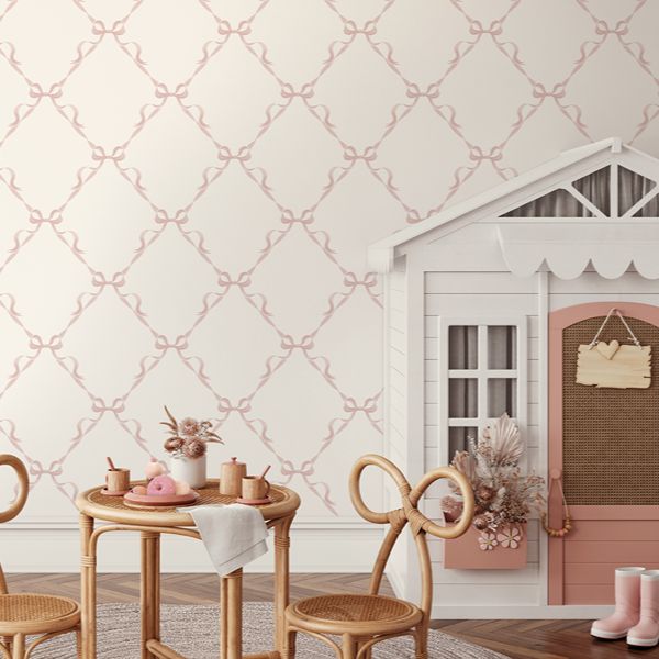 The design features a sweet trellis made of flowing ribbon delicately tied with bows in white, set on a soft blue backdrop with a soft matte finish.