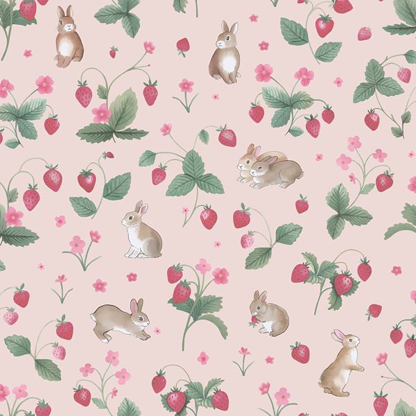 A beautiful all over design featuring adorable bunnies and cute strawberry motifs against a contrasting background.