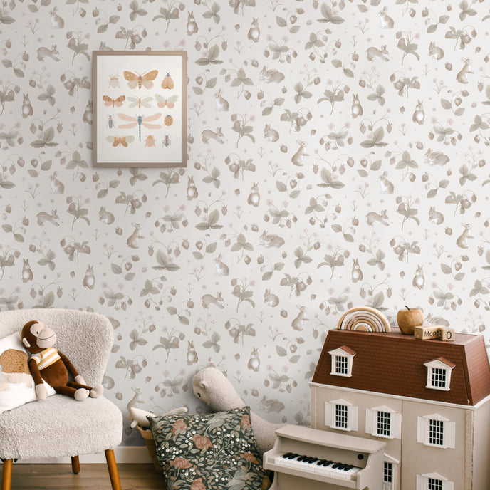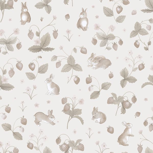 A beautiful all over design featuring adorable bunnies and cute strawberry motifs against a contrasting background.