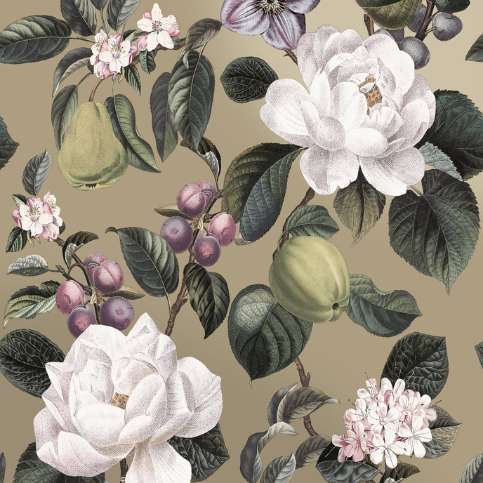 A design featuring pears and blossoms that sit on a range of a bold matt background.