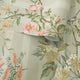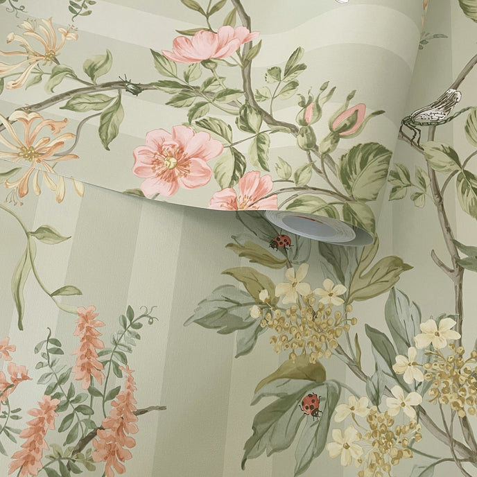 A floral trail on a subtle stripe ground with dragonflies hovering amongst the blooms and spring flowers.