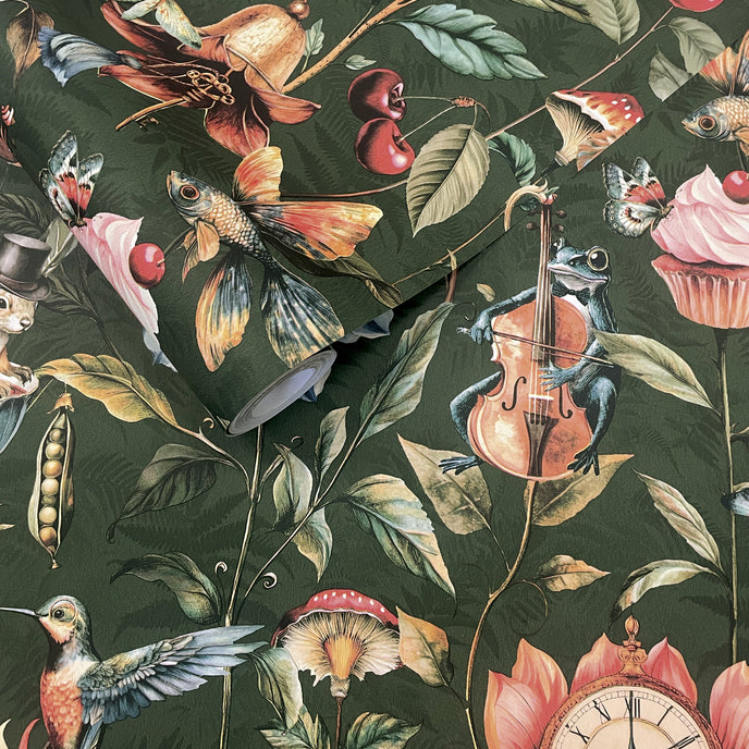An eclectic design with a mixture of animals and objects sitting upon jewel-toned backgrounds.