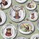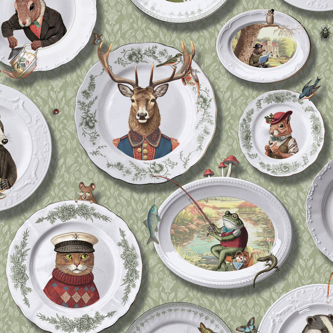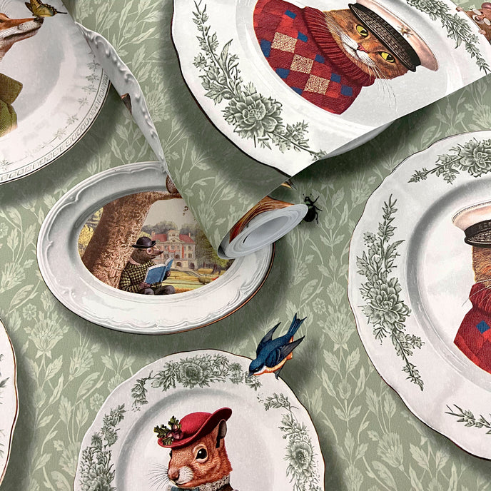 This vintage-inspired wallpaper features quirky animals engaging in playful activities.