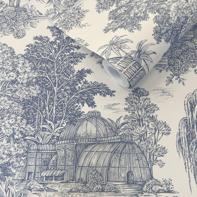 A vintage inspired toile featuring lush private gardens, glass houses and greenery.