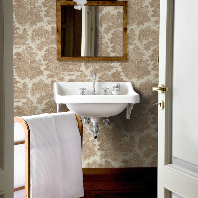A vintage inspired toile featuring lush private gardens, glass houses and greenery.
