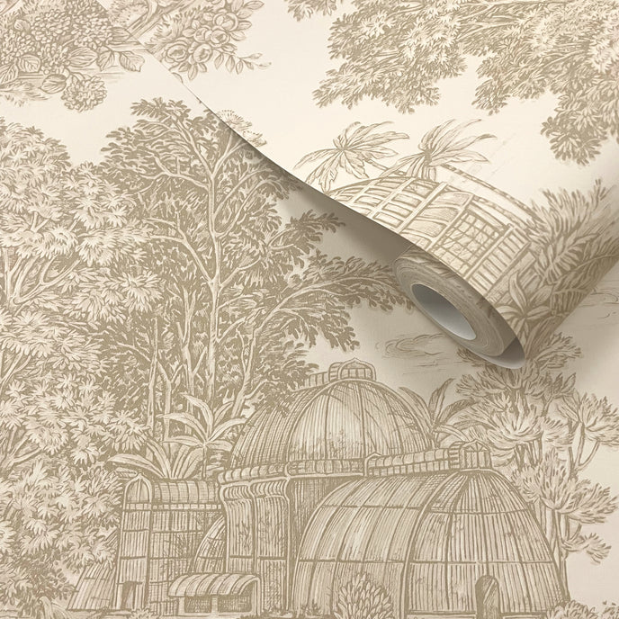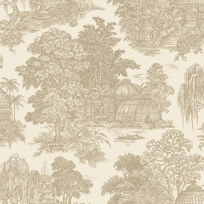 A vintage inspired toile featuring lush private gardens, glass houses and greenery.