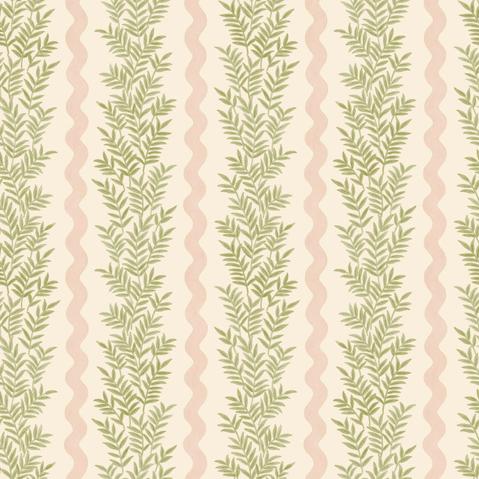 This modern take on a simple stripe features tonal leaves framed by a vertical structured wave.