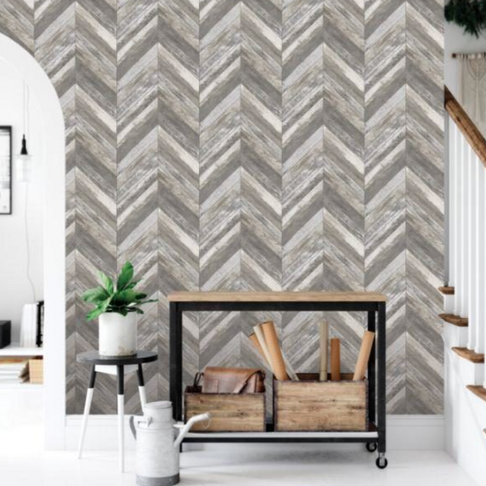 A design that brings impact to your walls. A wooden herringbone pattern in stunning greys, taupe and flashes of white.